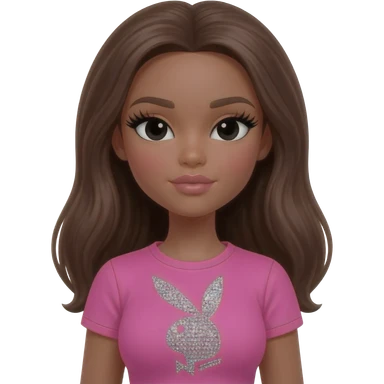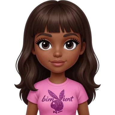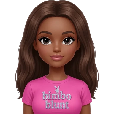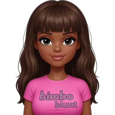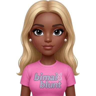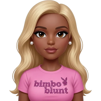 doll body , dark brown eyebrows, dark skin girl, pearl earrings stud, Long giant lashes, bimbo, black doll eyes, barbie, dark brown skin, with honey blonde hair, big breast, pink t shirt says on the sparkling text “bimbo blunt” emoji | AI Emoji Generator