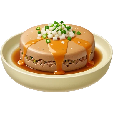 Emoji of a Chinese steamed pork patty in a small dish, topped with chopped scallions, soft texture, minimal style. emoji