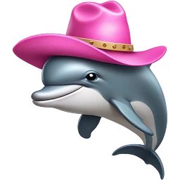 Dolphin with pink cowboy hat and super happy face, with a horse tail emoji