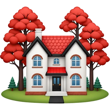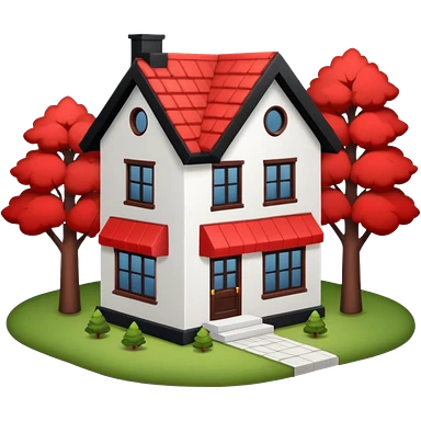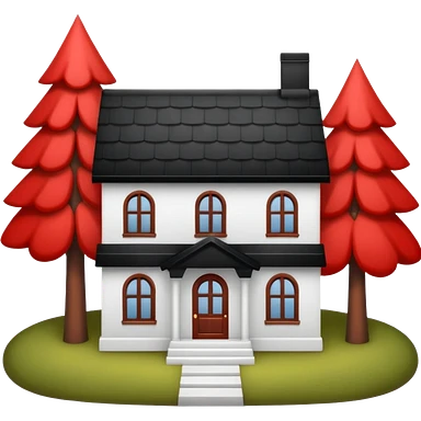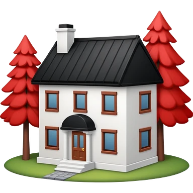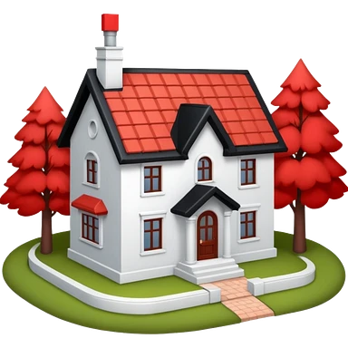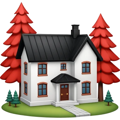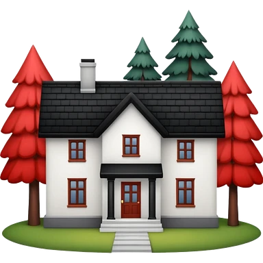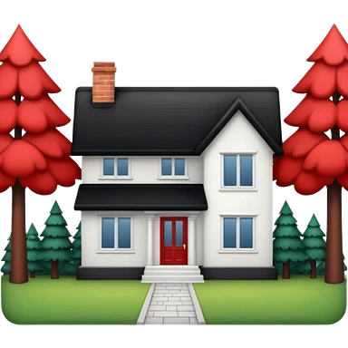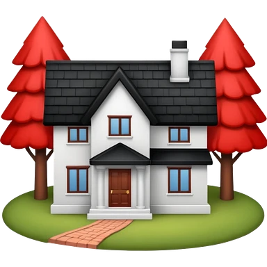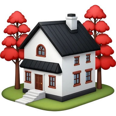 Dom z czarnym dachem i biała elewacja ze wstawkami z czerwonej cegły.Na drugim planie las. emoji | AI Emoji Generator