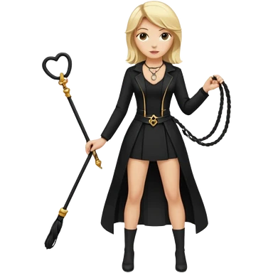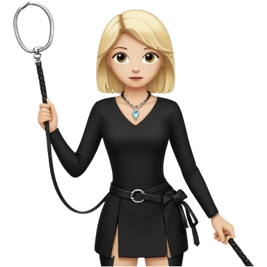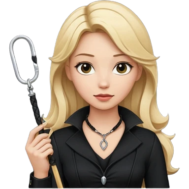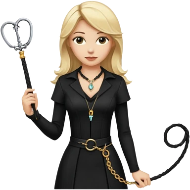 Dominatrix with blonde hair, black outfit, long key necklace, and a whip emoji