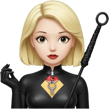 Dominatrix with blonde hair, latex outfit, old fashioned key necklace, and a whip emoji