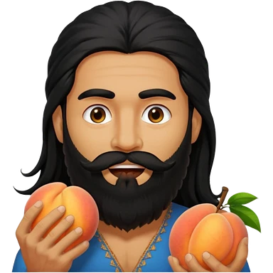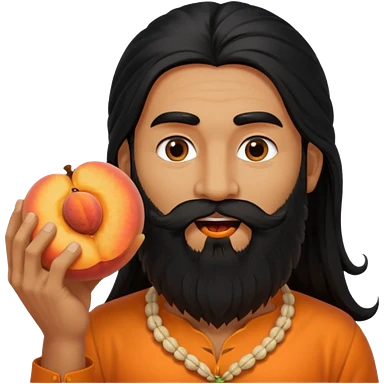 Indian man with a long beard and long hair has a peach in his mouth emoji