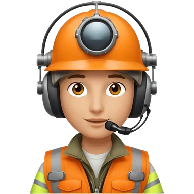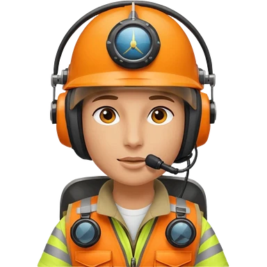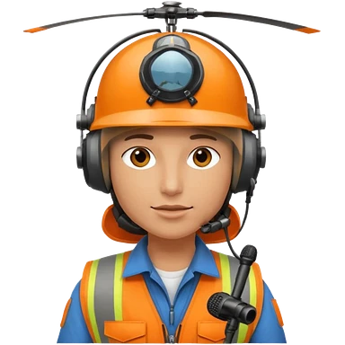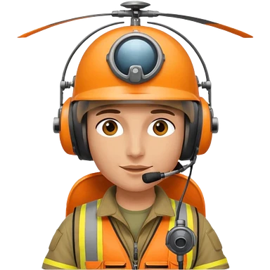 Helikopter-Flughelfer mit Oranger Weste und Helikopter Flug Helm auf dem Kopf inkl. am Helm integrierten Mikrofon vor dem Gesicht. emoji