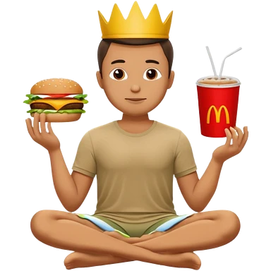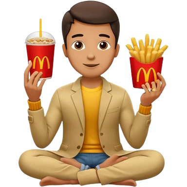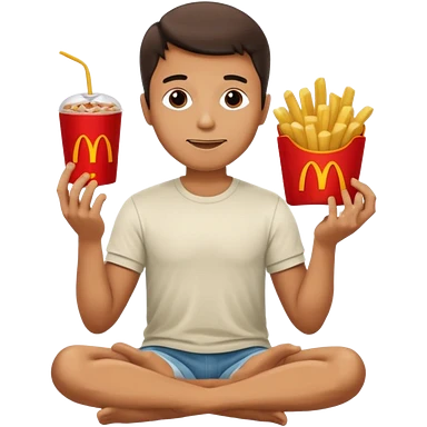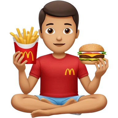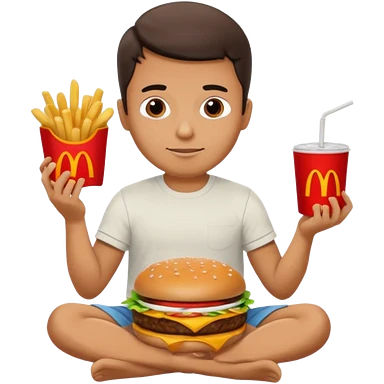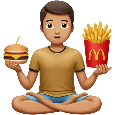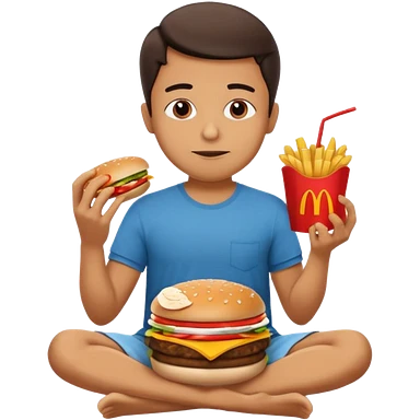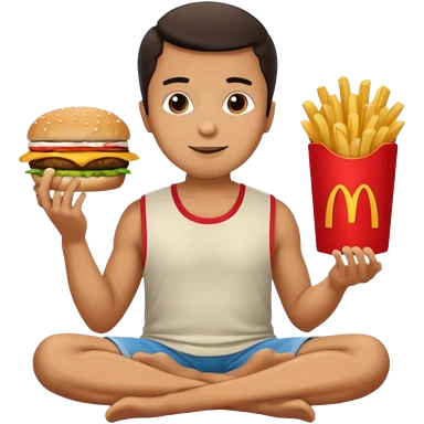man in lotus pose eating McDonalds burger and fries emoji