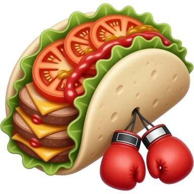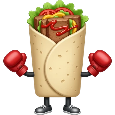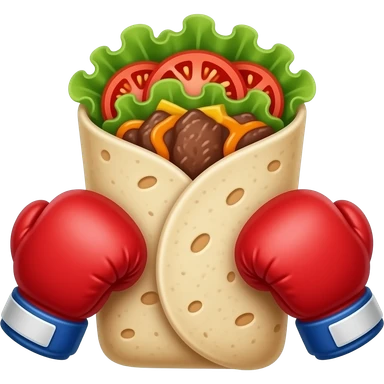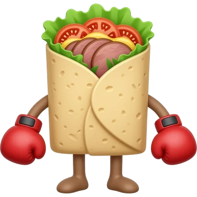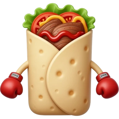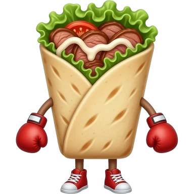 Doner kebab emoji, clearly visible layered kebab meat slices (not sausage), with salad, tomato and sauce, wrap visible, small boxing gloves, no arms or legs, cute competitive face, clean glossy emoji style emoji | AI Emoji Generator