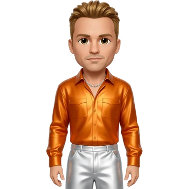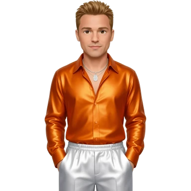 Donnie Wahlberg from NKOTB with brown eyes, golden brown hair, orange metallic shirt, white metallic baggy pants, silver necklace emoji