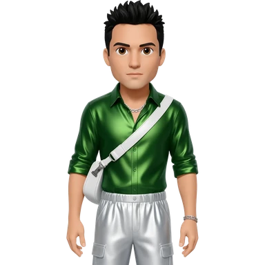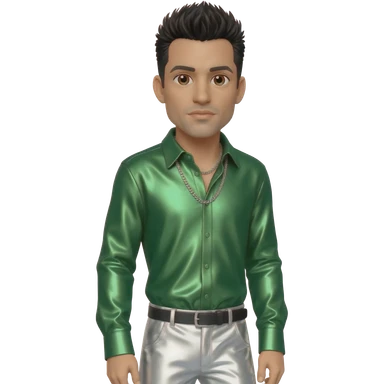 Danny Wood from NKOTB with brown eyes, black hair, green metallic shirt, white metallic baggy pants, silver necklace emoji