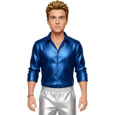 Joey McIntyre from NKOTB with blue eyes, golden brown hair, indigo metallic shirt, white metallic baggy pants, silver necklace emoji