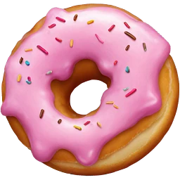 cartoon style round donut with a bite taken out, pink icing, sprinkles, playful look emoji