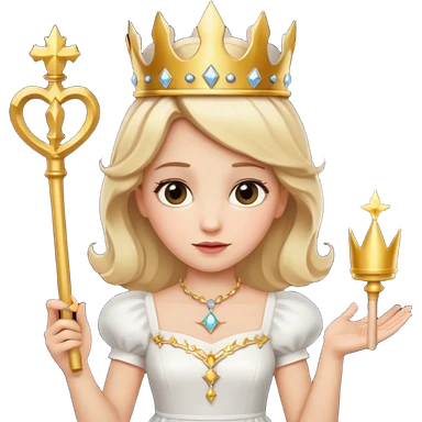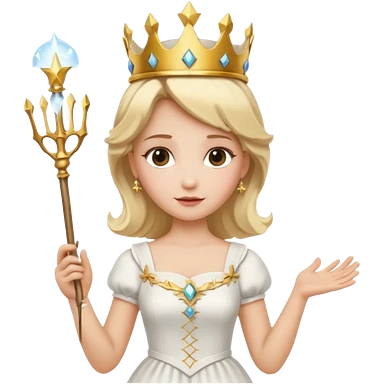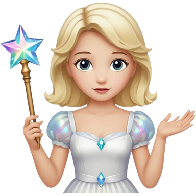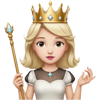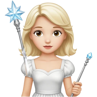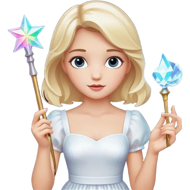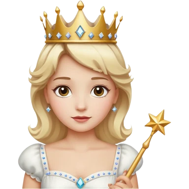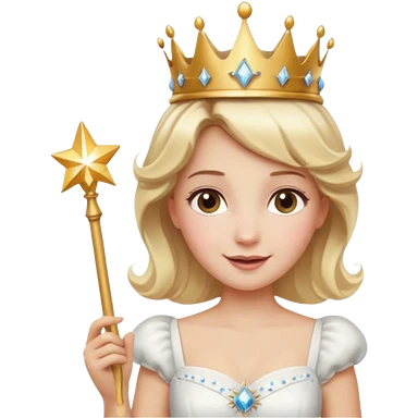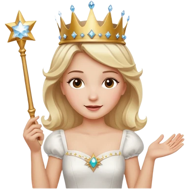 dorothy queen blonde hair, white dress with magic wand, rounded sparcle, and crown on head. emoji