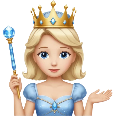 dorothy queen blonde hair, white dress with magic wand, rounded sparcle, and crown on head.Decolded blue dress emoji