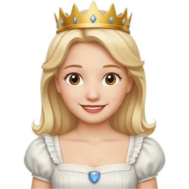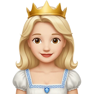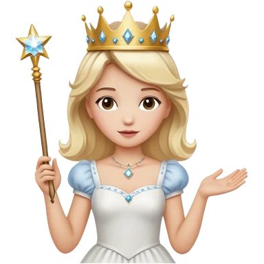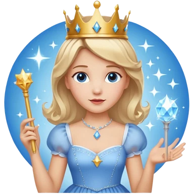 dorothy queen blonde hair, white dress with magic wand, rounded sparcle, and crown on head.Decolded blue dress emoji | AI Emoji Generator