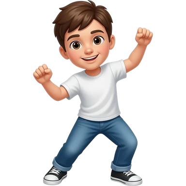 Un chico bailando con camisa blanca, manga larga metida por dentro abierta hasta el ombligo emoji