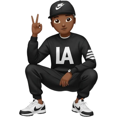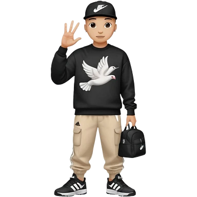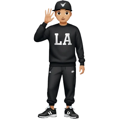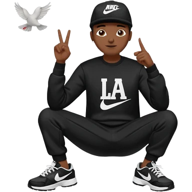 Crea Un Emoji De Cuerpo Completo Que Sea Hombre Con Corte Alucin Que Tenga Gorra Nike, Suéter Negro Que Tenga La Letras LA El La Parte Del Corazón, Zapatos Adidas Con Una Palomita✅, Pantalón Ancho O Bellaco Con Unos Diseños De Palomas Blancas Y Asiendo Una Pose Con Su Mano Que Sea Está 🤙🏽. emoji