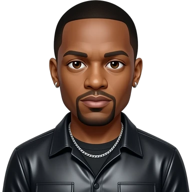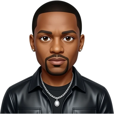 Dr Dre with dark brown eyes, black hair, black metallic shirt, silver necklace and short earrings emoji
