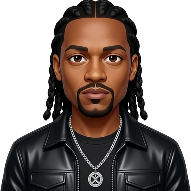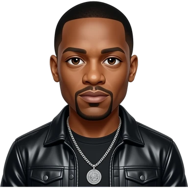 Dr Dre with dark brown eyes, black buzz cut hair, black metallic shirt, black metallic jacket, necklace emoji