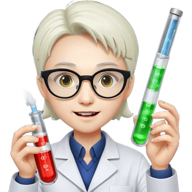 Portrait of a young scientist wearing a white lab coat, glasses, holding a test tube, curious expression emoji
