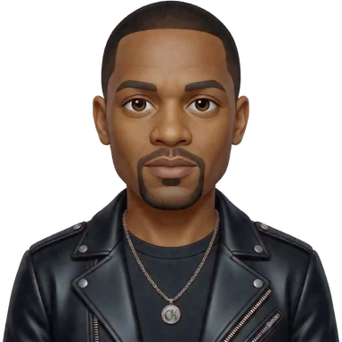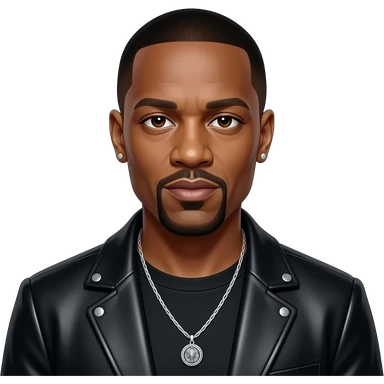 Dr Dre with dark brown eyes, black buzz cut hair, black metallic shirt, black metallic jacket, necklace emoji