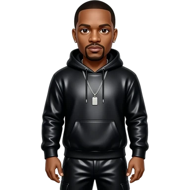 Dr Dre with dark brown eyes, black buzz cut hair, black metallic sweatshirt, black metallic baggy pants, necklace emoji