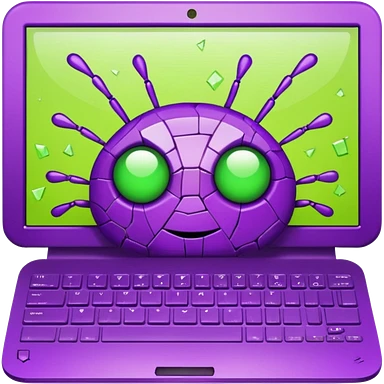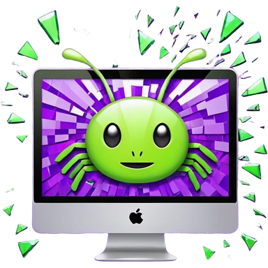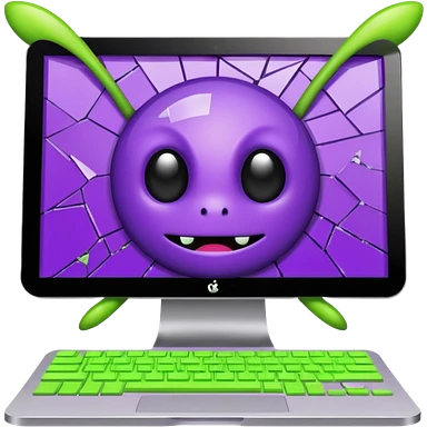Broken computer screen with poxelated bugs. Color scheme is purple and limegreen emoji