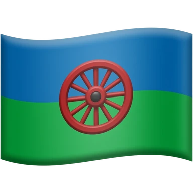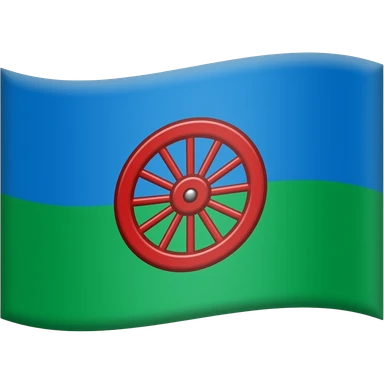 Drapeau avec deux parties coupés à l'horizontale partie du bas verte et celle du haut bleu, une roue des 16 chakra rouge est en plein centre c'est le drapeau de roms emoji