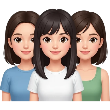 Draw three Asian girls: one brunette, one fair-haired, and one who looks like a dark-haired brunette but has dark brown hair. The fair-haired girl has short, but not bobbed, black hair, and the brunette has medium-length hair. emoji