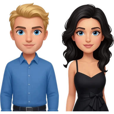 Draw a sweet, blonde, blue-eyed man wearing only a blue shirt and no accessories, and a Kurdish woman with black hair wearing a black dress and no accessories. emoji