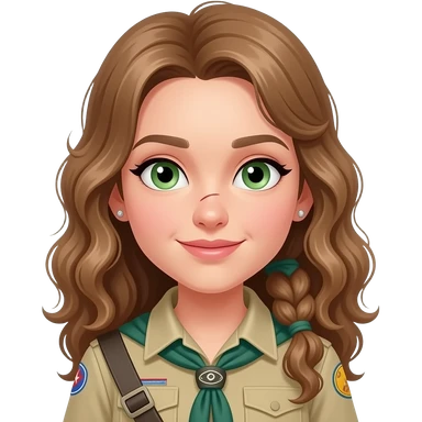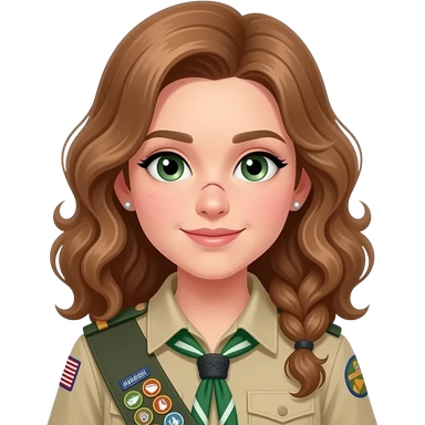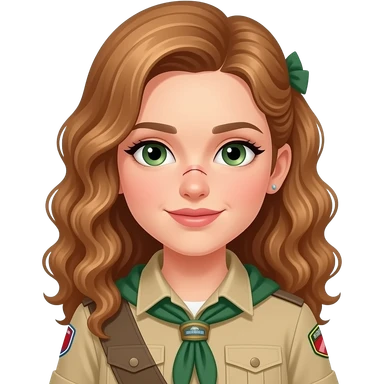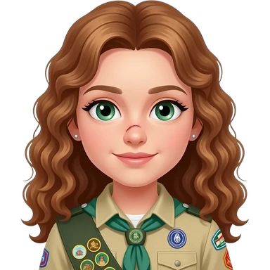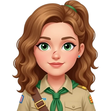 draw a girl in scout uniform with light brown ,curling , long hair in a low ponytailand green eyes and a scar on her nose she has also some earrings and the hair is flat emoji | AI Emoji Generator