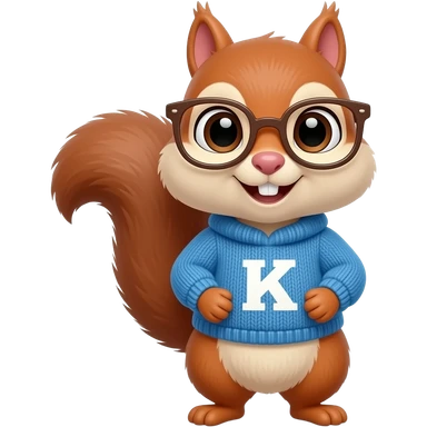 Draw Simon the chipmunk as a female with K written on a blue sweater and a brown glasses emoji