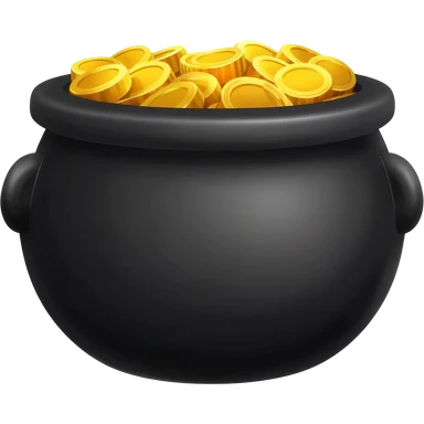 A heavy black cast iron cauldron filled to the brim with glowing gold coins. 3D isometric style, high gloss, shiny metallic texture, vibrant yellow gold, clean white background, Apple emoji aesthetic, soft studio lighting. emoji
