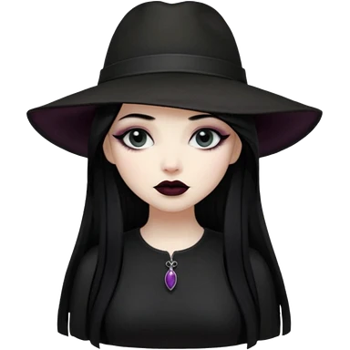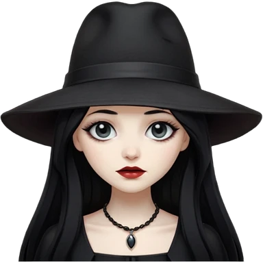 Female Goth with Wide-Brim Hat Long straight black hair, white skin, black dress, wide hat casting shadow over eyes. emoji