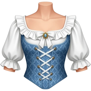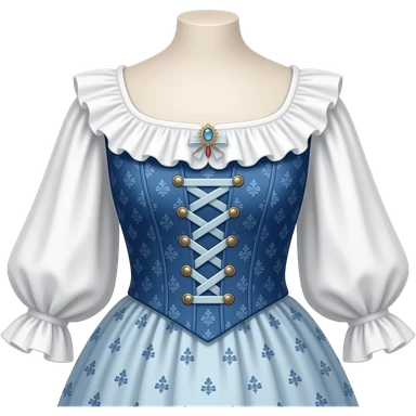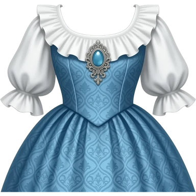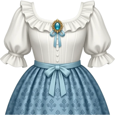 dress southern belle style colonial style white ruffled top with small brooch with blue patterned skirt emoji