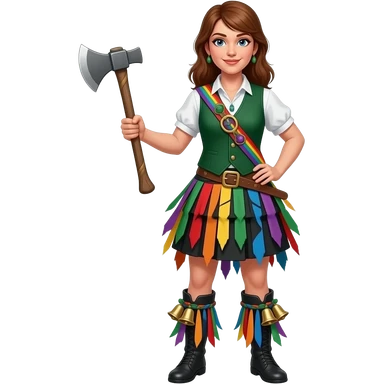 Female Border Morris dancer with axe-handle-sized stick in hand and christmas bells on shins only with rainbow tatters coming off her waist and vest emoji