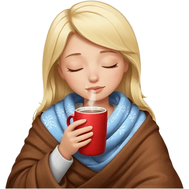 blonde girl eyes closed long eyelashes under a blanket drinking hot chocolate emoji