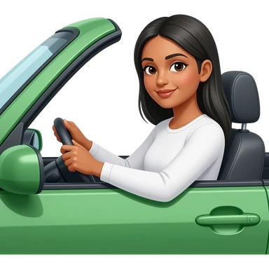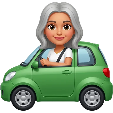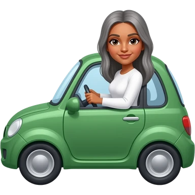 Dark skinned Indian woman with white long sleeve top with straight grey straight hair driving in green car car w emoji
