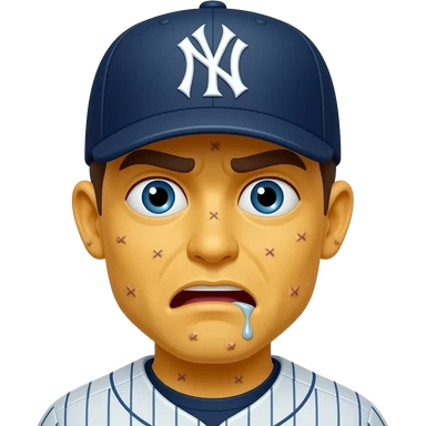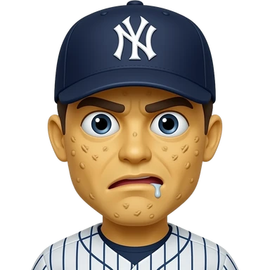 Yellow 3d emoji, New York Yankees hat, drooling mouth slightly open, covered in warts, crossed eyes stupid emoji