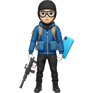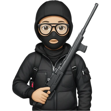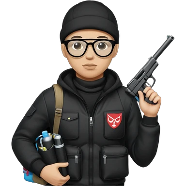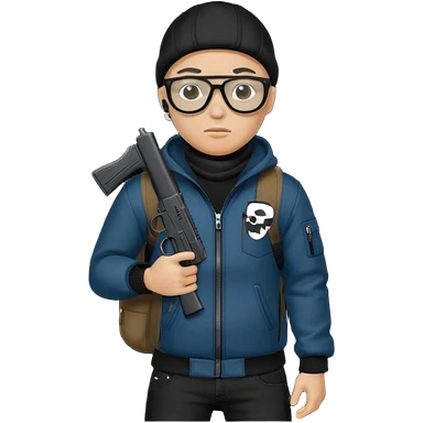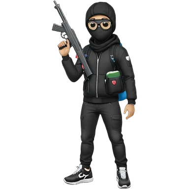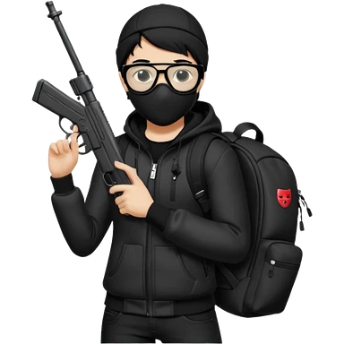 YN wearing a ski mask, holding a gun, all black fit, black jeans, Sprayground bookbag, confident stance, with glasses emoji