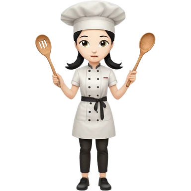 A beautiful girl wears a white chef's uniform. Her long, straight black hair is styled in a ponytail. She wears a white chef's hat and holds a wooden cooking spoon. She is standing and wearing black shoes. The illustration style is 2D realistic.. emoji