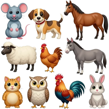 Duck, mouse, dog, horse, sheep, chicken, donkey, pig, goat, cat, owl, rooster, rabbit emoji