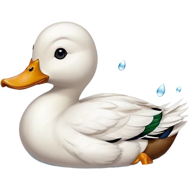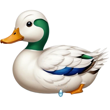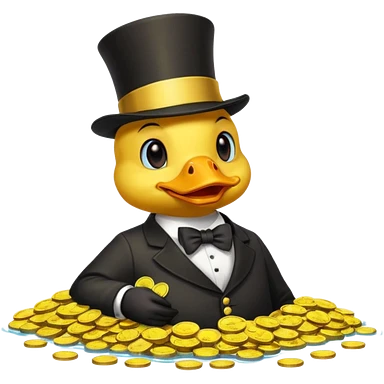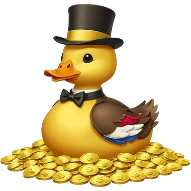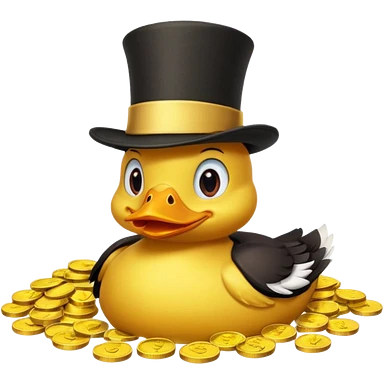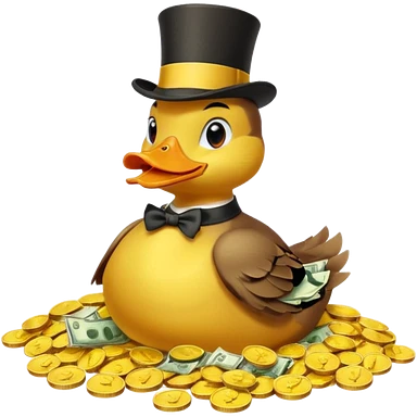 Duck character in top hat swimming in pile of gold coins and money bags emoji