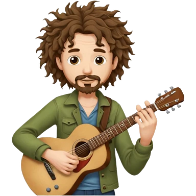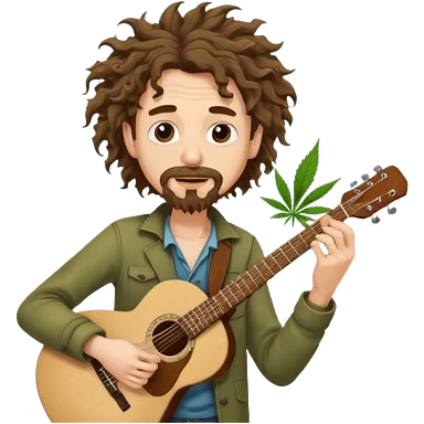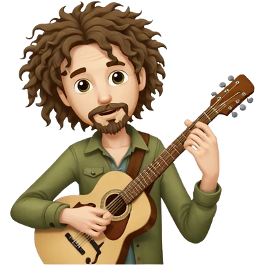 Generate a malnourished dude with curly hair and a shitty goatee who is high on marijuana playing the guitar and twisting a strand of his hair emoji