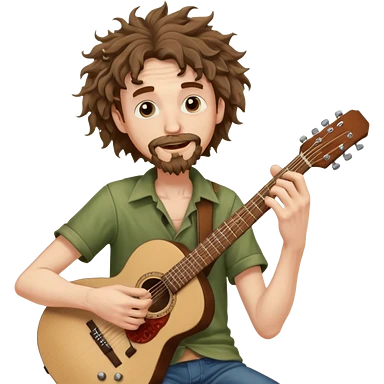 Generate a dude with curly hair and a shitty goatee who is high on marijuana playing the guitar and twisting a strand of his hair emoji
