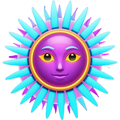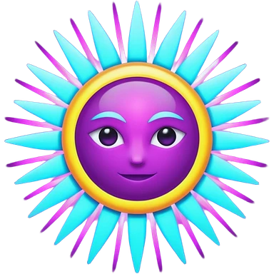 Futuristic glowing sun emoji, neon rays, bright holographic purple and cyan glow, dark background, digital tech style emoji