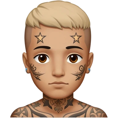 Duki has small face tattoos, including a star near his eye and script on his forehead. He also has visible neck tattoos, often with symbolic or personal meanings. emoji