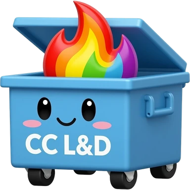 a blue dumpster with a cute face and rainbow fire and on the front and the words CC L&D emoji