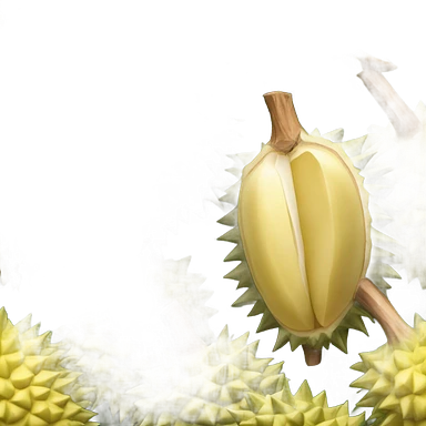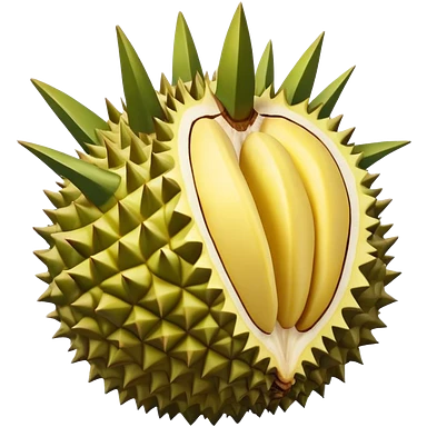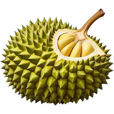 Cinematic Realistic Durian Fruit Dish Emoji, depicted as the notorious spiky fruit with a rich, custardy interior rendered with lifelike detail and bold, distinctive lighting. emoji