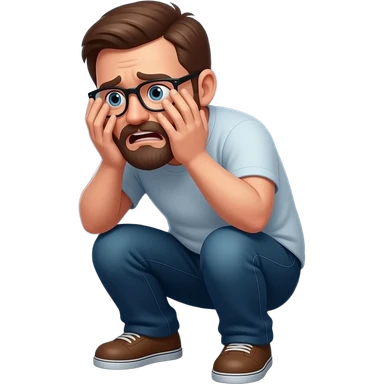 Frightened man with glasses and a beard crouching in a corner covering his face in fear emoji