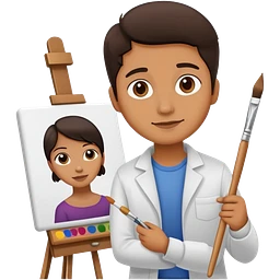 an image of an artist’s studio, complete with an easel, a palette filled with colorful words, and a half-finished painting that includes some sentences scattered across the canvas emoji
