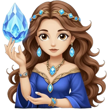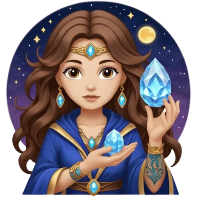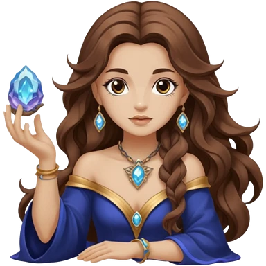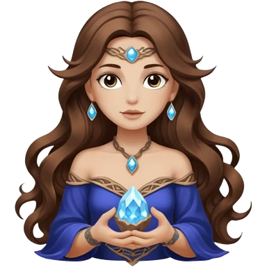 crystal moon mage woman long wavy brown hair tattoos small geode emoji
